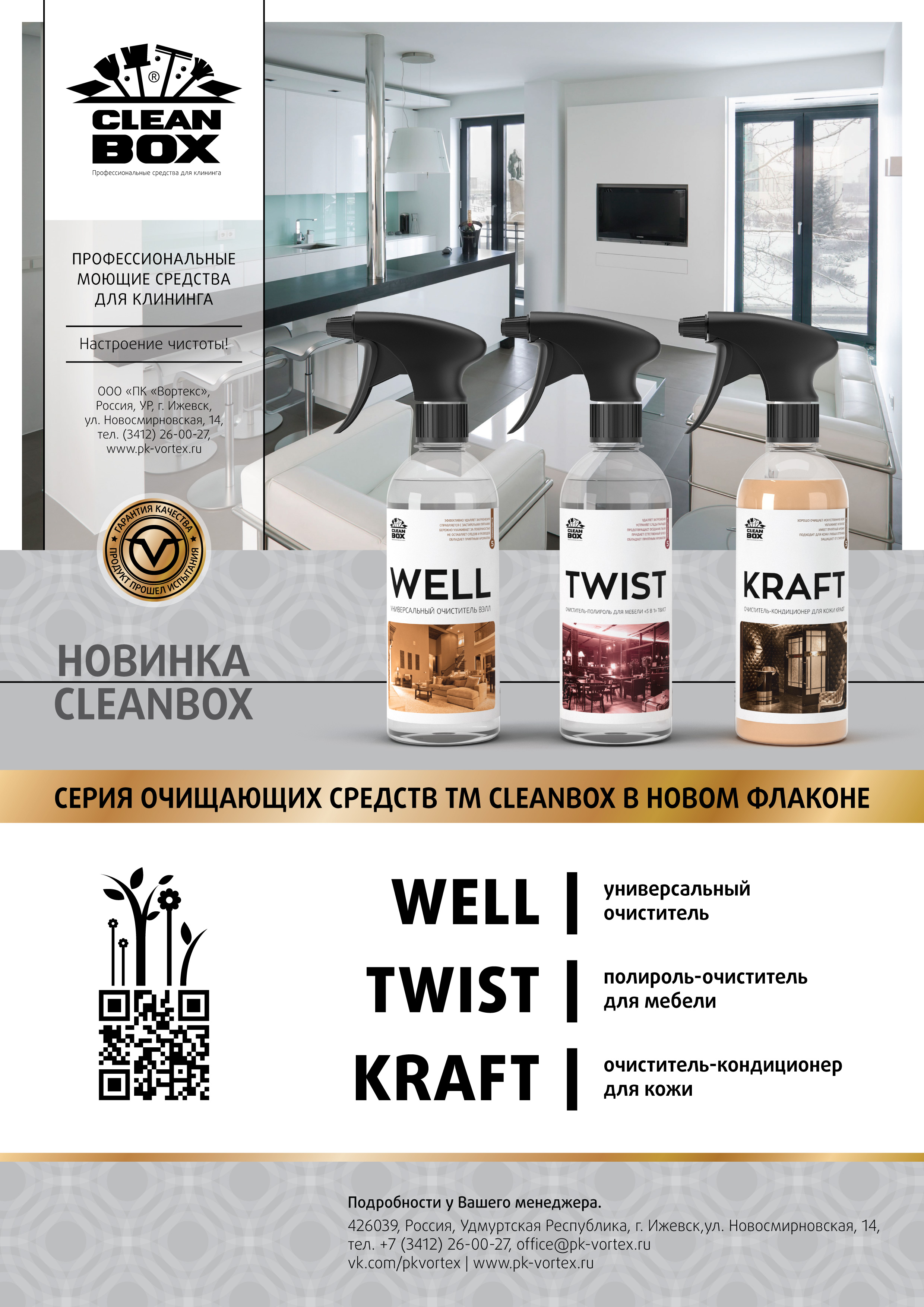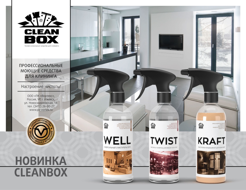 Стартовали продажи новых розничных продуктов ТМ CleanBox: Well – универсальный очиститель 0,5л Twist – полироль-очиститель для мебели 0,5л Kraft – очиститель-кондиционер для кожи объемом 0,5л и 0,25л.